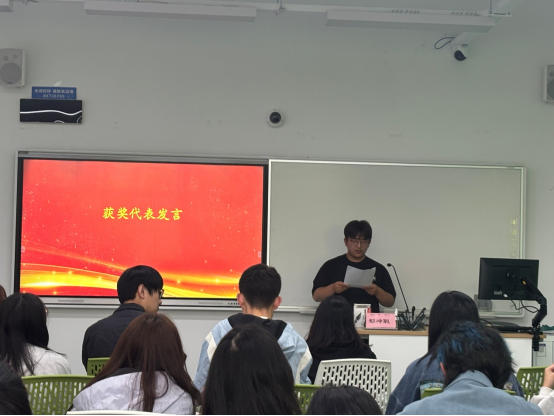 获奖代表曹伟军同学上台发言,他讲解了自己的作品《社火》的灵感来源及其内涵意义,表达了自己对家乡甘肃社火文化的喜爱,并表示自己会秉持热爱与初心继续创作下去。