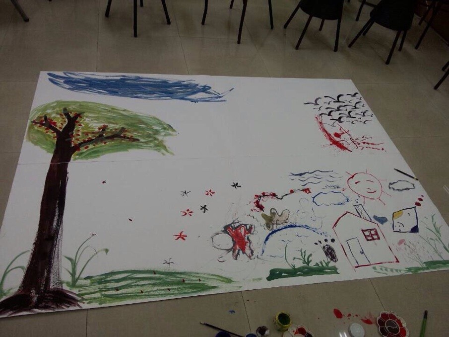 笔者刚进入心灵小栈的时候,地上铺设了一张大大的白纸,同学们陆续地进入了小栈。在茉莉花茶和玫瑰花茶的芬芳下,同学们拿起白纸边的画笔,沾上自己喜欢的颜色,在白纸上华上了蓝色的清澈的云,一棵粗壮的树,一座房屋,一个笑脸一样的太阳,许多飞翔的大雁……随后进来的同学更是纸上生花,他们画上了绿色的草,仿佛被风吹得凌乱了,似是逼真。