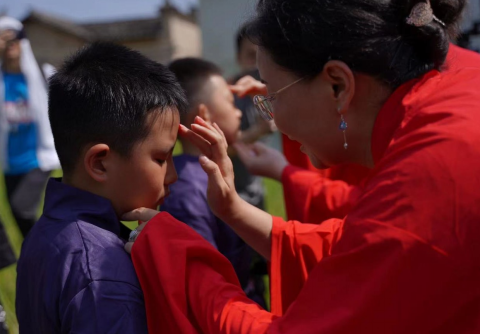 随后,在有着“笔墨纸砚”意象的村中心——月池边,刘亚辉老师和王文奇老师为孩子们“朱砂启智”。孩子们分别向老师和父母行礼,父母和老师给孩子们送上文具和祝福。