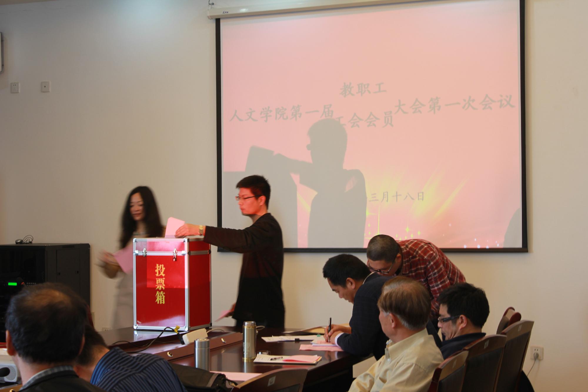 人文学院第一届教职工暨工会会员大会第一次会议在7号学院楼404会议室隆重举行,校工会副主席白羽、学院党政领导和全体教职工出席大会,会议由学院党总支副书记吴玻主持。