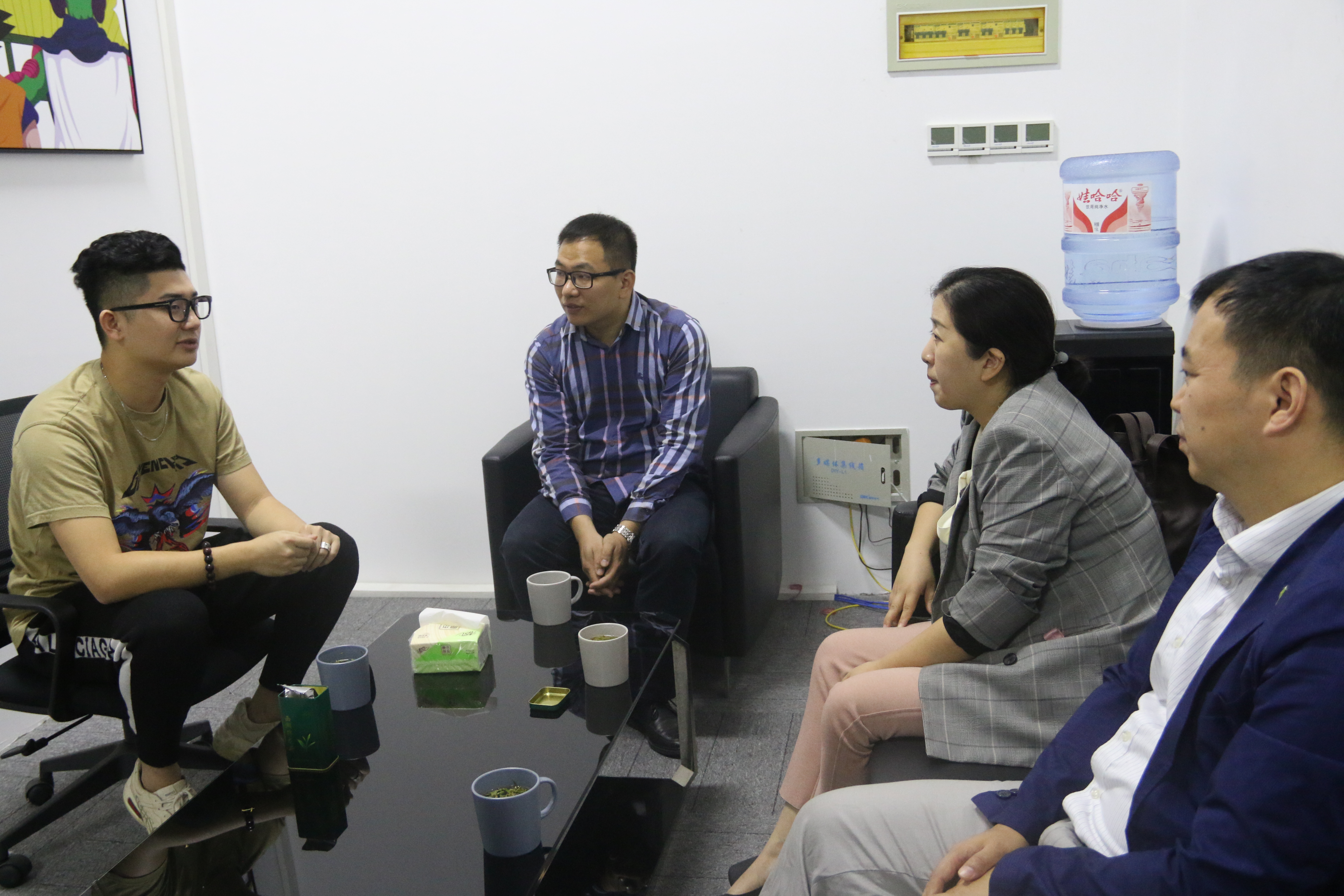 詹天卓校友向学院老师介绍了公司近况及自己创业历程,对母校的关心和支持表示感谢,双方就专业建设、人才培养等方面进行了探讨和交流。詹天卓表示,母校的专业教育和品德培养为其创业奠定了坚实的基础,并针对学院新设专业的发展给出了建议和创意。