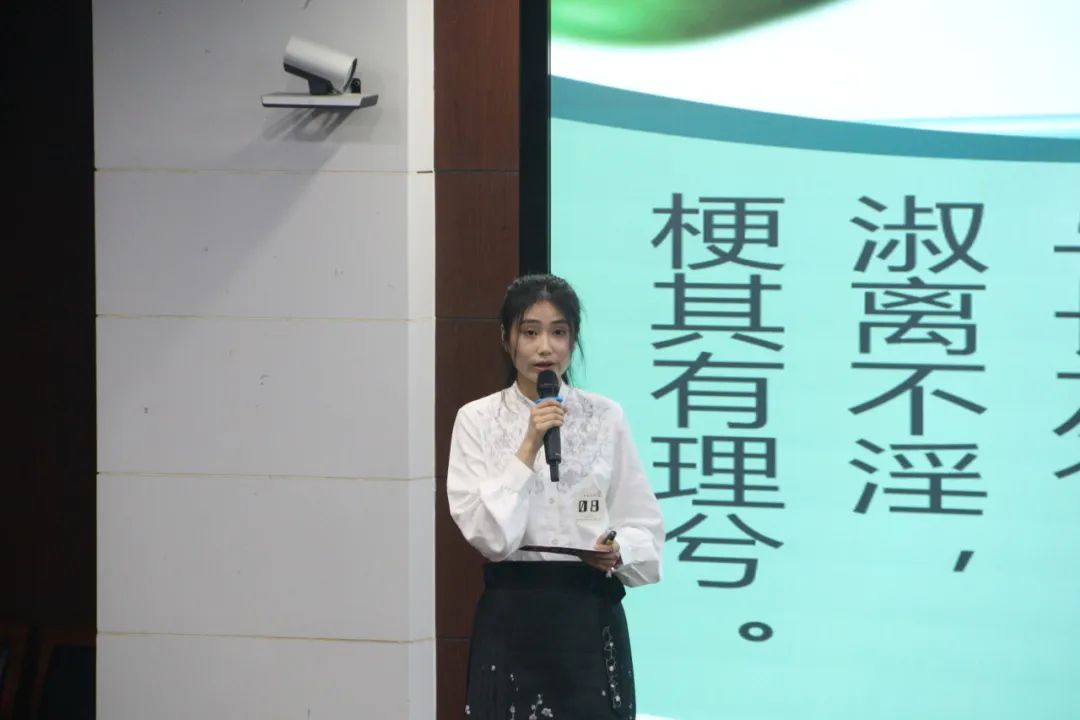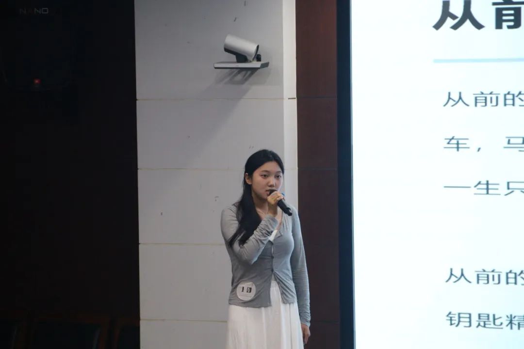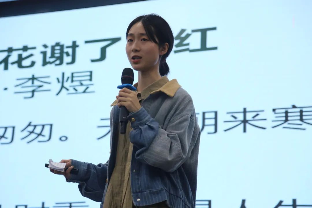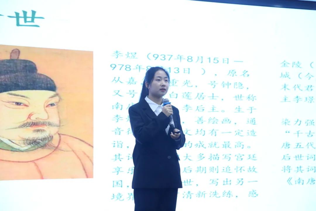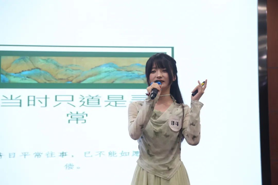 随着比赛拉开帷幕,陈杏佳选手一马当先,声情并茂地讲解《相见欢》。她从“谢”字出发,通过一条时光隧道引领我们穿越千年风尘,抵达金戈铁马、家国天下的时代,与“风流才子,误作人主”的词人心灵交汇,在相见之欢与离别之苦交织而成的旋律中共同探寻生命之谜。