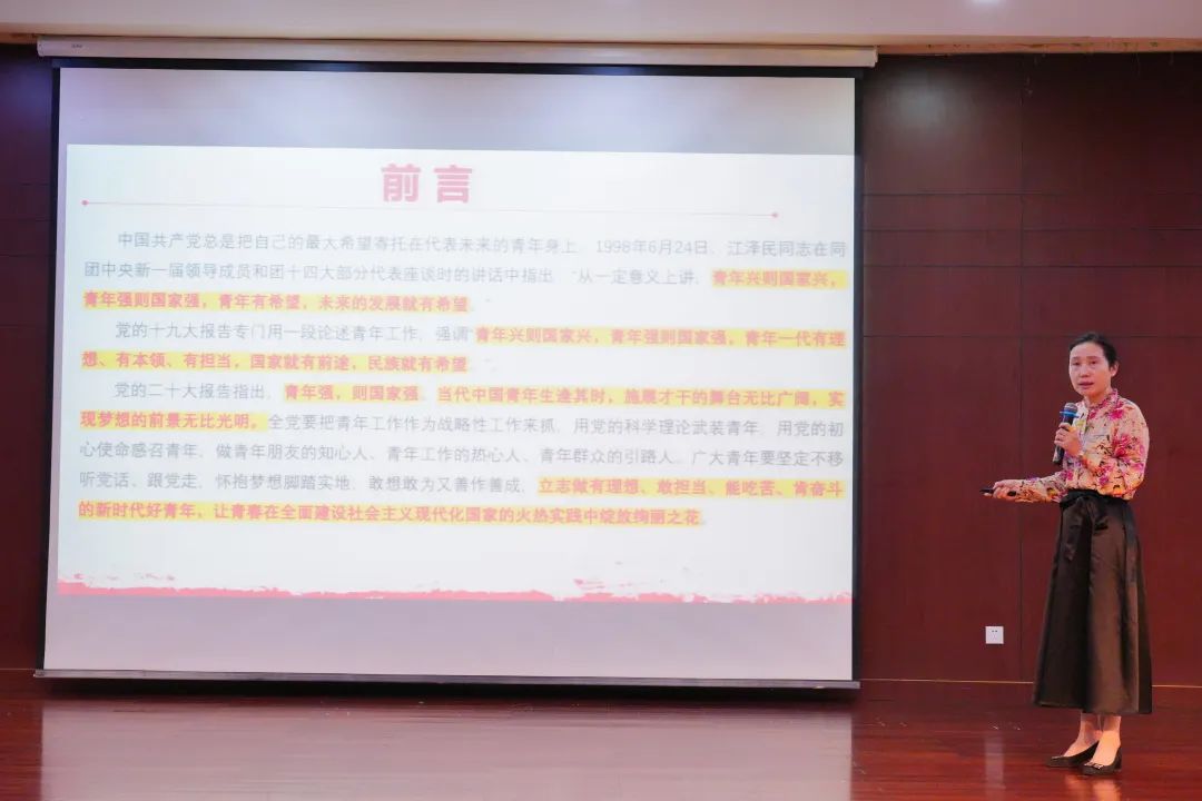 的基本概况开始,介绍了学院机构设置、师资力量、往年学院及学生风采等内容,展示了人文学院的深厚底蕴和卓越成就。同时,老师也以理想为人生动力,以责任为内化行为,以担当为时代使命,鼓舞在座的广大青年学生奋斗于当下的青春,为青春倾注全部的热爱和真情,更要在新时代的舞台上尽情施展才干、实现梦想,为国家的昌盛繁荣而接续拼搏。