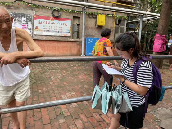 首先,孙德平老师带领实践团的同学们走访了洛轴的生活园区,这里以老年人居多,他们的父辈来自五湖四海:东北、江苏、浙江、上海、湖南……他们有着迥异的方言背景,随着时间的推移和了解的深入,人们的语言使用和语言面貌发生着变化。几十年过去了,大家原本不同的风俗习惯逐渐趋同,“一开始我们必须说普通话才能交流,现在大家说话都带着一股河南味儿,哈哈哈”,大爷来自外地,但说起洛阳的特色方言词却是滔滔不绝,知道同学们要录音,热情地拉着同学们说个不停。