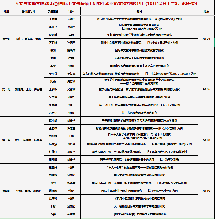 2023级国际中文教育专业硕士学位论文预答辩举行,共有26位研究生参加本次学位论文预答辩。预答辩分为四个小组,每个小组三位答辩专家。答辩地点分别在教学楼A楼的104、106、108、110教室。具体分组情况如下: